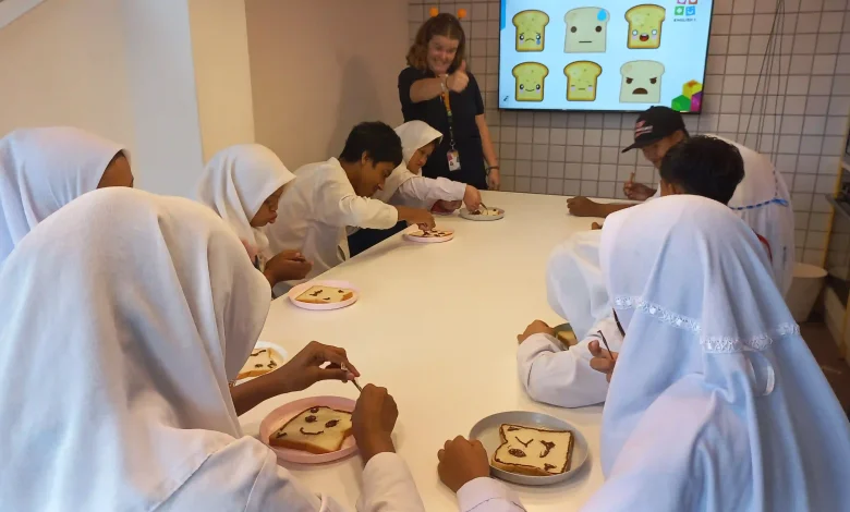 Para siswa diajak bermain dan belajar bahasa Inggris tentang warna, perasaan, dan mempratikkannya dengan membuat roti menggunakan selai cokelat.